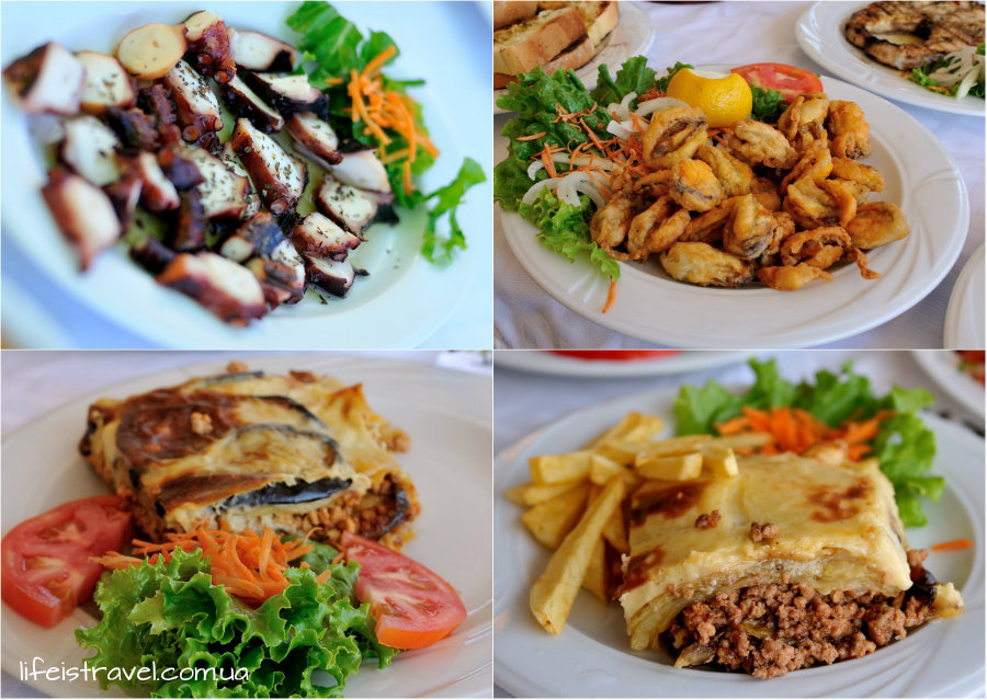 Три основных кита греческой кухни – оливковое масло, рыба и морепродукты и овощи. К минимуму сведена роль картошки, кстати в более дешевых ресторанах в той же мусаке картошки будет больше в два раза чем в правильных тавернах. А осьминоги! В Киеве свежие осьминоги настоящему гурману могут только присниться – те полудохлые заморыши, спящие во льдах супермаркетов, годятся разве что на комбикорм.