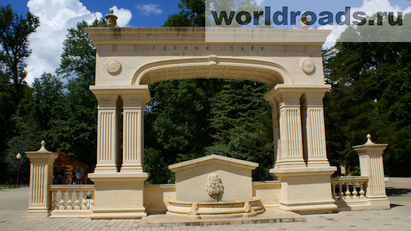 Арка Горный парк воздвигнута совсем недавно, в 2009 году, к 145-летию курорта. За аркой начинается зона набережной и горная часть парка.