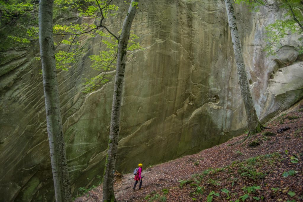 Скала Зеркало в верхней части отвесная и гладкая, как стена. А когда на нее падают солнечные лучи, то поверхность светится и создает эффект зеркала.