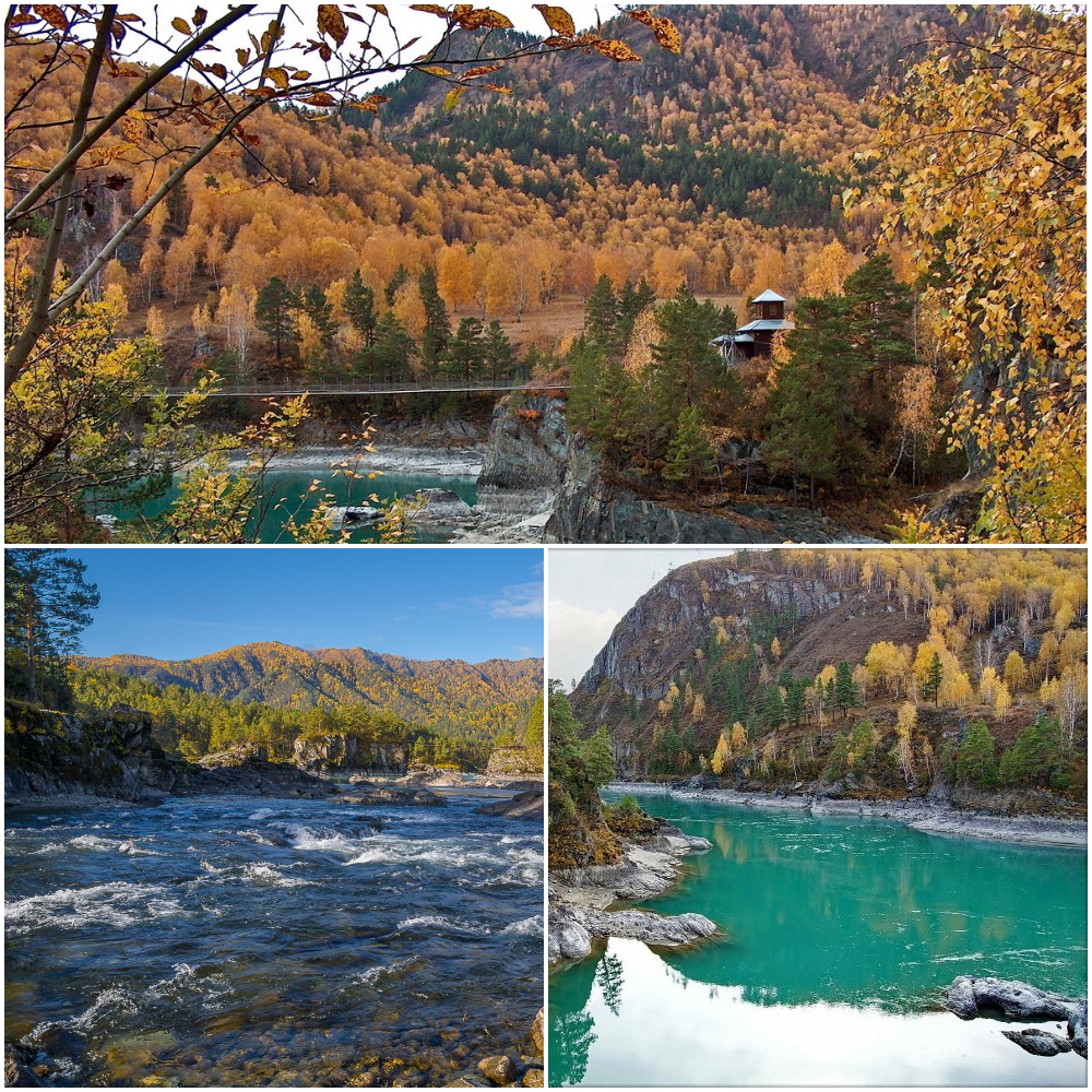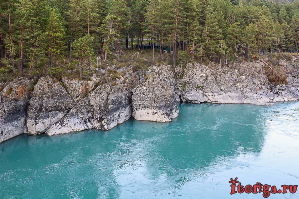 В зависимости от освещения и времени суток цвет в реке меняется. Катунь на Горном Алтае может быть не только бирюзовой, её цвет варьируется от голубого до бледно-зелёного.