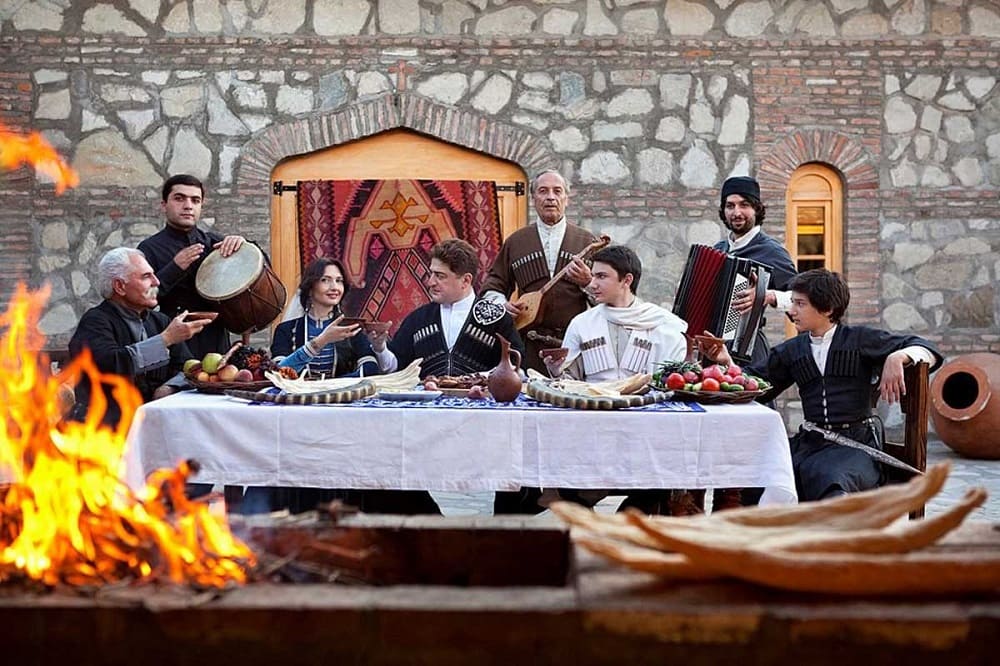 - Новогодний стол ломится от вина и вкуснейших блюд – сациви, хачапури, гозинаки и еще множество яств. Кульминационный момент – грузинское многоголосное пение.