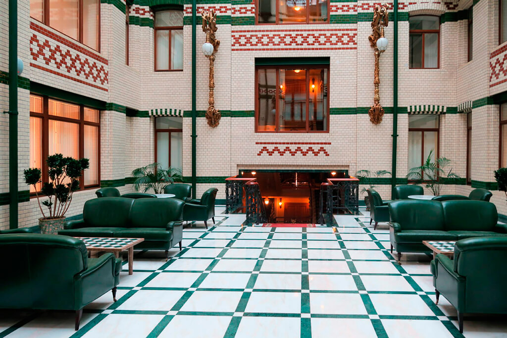 Внутренние стены дома украшены новой венецианской штукатуркой, красивыми декоративными элементами с использованием сусального золота. Вновь засверкали мозаичный пол, кованые элементы, дубовые двери, рамы, облицовочный гранит. Полностью восстановлена кровля из меди, плитка на стенах внутреннего дворика. Наибольшее впечатление при осмотре внутренних помещений вызывает вид вестибюля. Ассиметричная лестница, центральный зал в форме атриума гармонично сочетаются с криволинейными узорами на кованой бронзе, отражением полированных гранитных плит.
