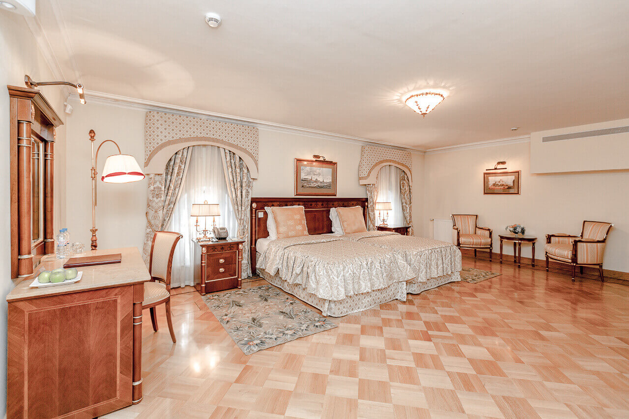 Апартаменты «Делюкс» разделены на несколько зон: спальную, гостиную с камином и кабинет. В номере есть гостевая туалетная и гардеробная комнаты.