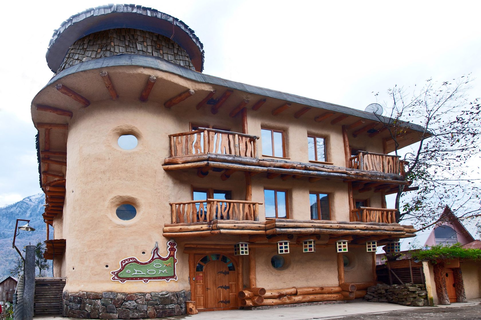 Отель, выполненный в необычном экодизайне, находится рядом с поселком Красная Поляна на высоте 600 метров. Глинобитные стены в тибетском стиле органично сочетаются с бревенчатыми опорами, а угловая башня делает здание похожим на средневековый замок.