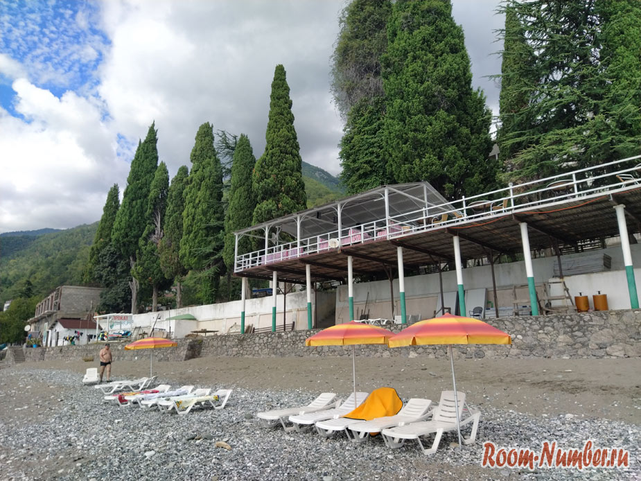 Вдоль береговой линии встречаются отели и дома отдыха. Как правило, они дороже, чем жилье на 2-3 линии, но туристов там всегда много и свободные номера выпадают не часто. За каждым таким пансионатом закреплены лежаки. Где-то даже платные, что весьма странно.