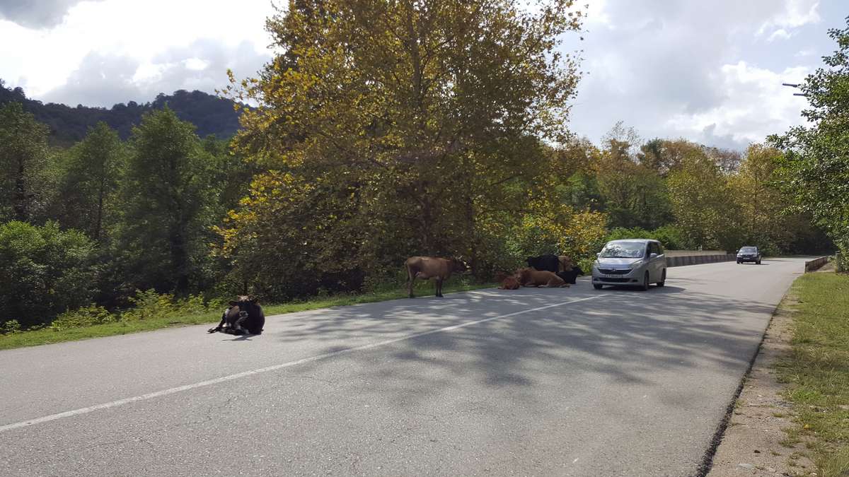 Дорога до Нового Афона заняла около часа, ехали по правилам 60-90 км/ч. По дорогам разгуливают коровы, машины их объезжают. Что-то подобное я наблюдала и в Гоа.
