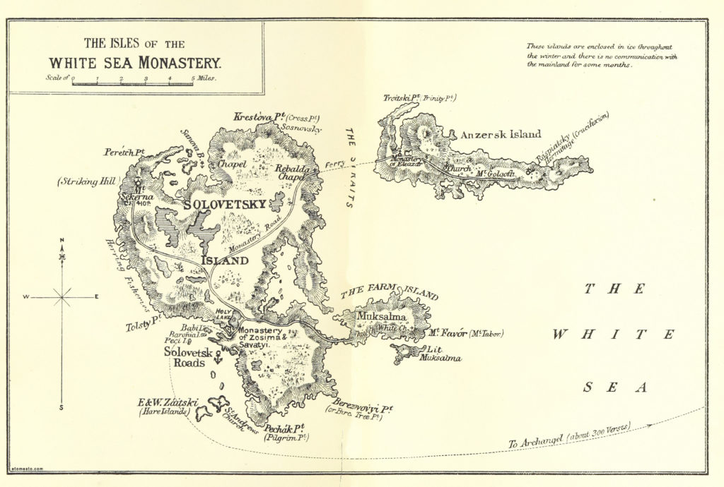 Соловки — острова «молодые». Около 7-6 тысяч лет до нашей эры ледник, отступавший на север, покрыл кристаллическое основание будущих островов мощным слоем валунов гальки и песка. Камни покрылись зеленью, леса заполнили звери и птицы… Соловецкий архипелаг в самом южном из морей Северного Ледовитого океана раскинулся на той же долготе, на которой несколькими тысячами километрами южнее находится Иерусалим. Между прочим, и там, и там есть гора Голгофа.