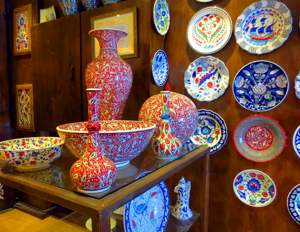 На турецких улицах часто встречаются магазины с керамикой и посудой ручной работы — декоративные тарелки, вазы с ручной росписью, оригинальными узорами, вставками из камней и бисера. Выглядят эти изделия очень красиво и по-восточному.