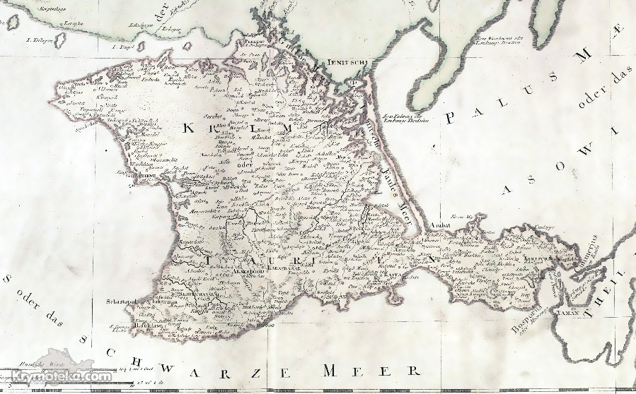 Карта авторства Шмидта Оригинальное название Karte Tauriens oder der Halbinsel Krim und der Westlichen Nogayischen Tatarei. Автор Schmidt, Johann Friedrich. Составлена с 1730 по 1785. Издатель F. A. Schraembl, Franz Anton. 1787 год. По ощущениям автор перестарался с названиями и пренебрег формой. Значит, такие были приоритеты.