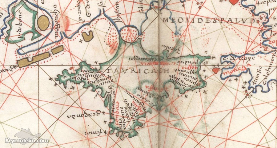 Мореходная карта 1559 года дает понять, что для высадов больше использовались бухты южной части полуострова от Бакальской косы до Казантипа. Не удивительно — ныне любимая нами но мало обитаемая Арабатская коса не могла дать ни пристани, ни доступа на материк, а весь север полуострова с его солеными озерами был не актуален иноземным мореплавателям.