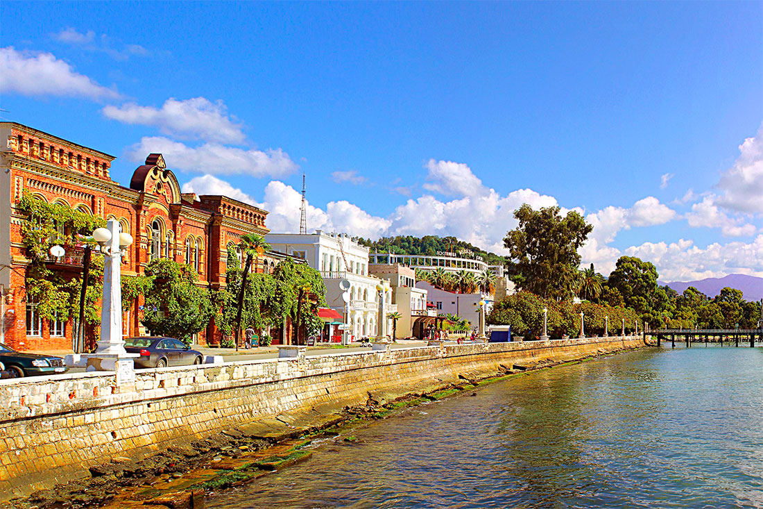 Там, где начинается набережная, расположены важные государственные учреждения: администрация Президента Абхазии и Народное собрание республики. Но главное украшение набережной — это старинные здания прошлых веков. Здесь можно рассмотреть белокаменные дома с красивыми балконами, а также шикарные особняки, в строительстве которых использовался венецианский кирпич.