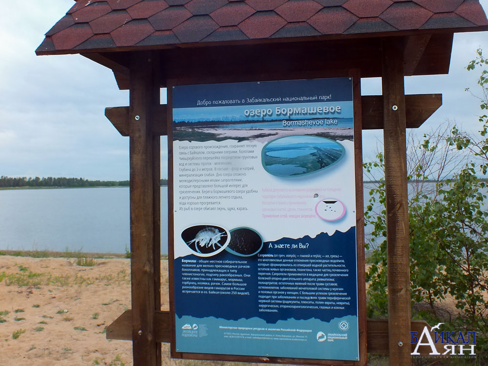 Спустя 3,3 км по дороге будет соровое озеро — Бормашевое, не более 3 м в глубину с песчаными берегами, хорошо прогревающееся летом. Здесь можно купаться. Кроме того, озеро лечебное, — вода в нем слабоминерализованная, а на дне залегают лечебные грязи.