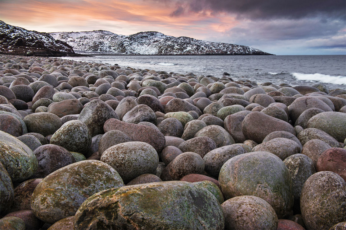 Еще одно классное место — каменный пляж. Он полностью покрыт причудливыми круглыми валунами, из-за чего его называют пляжем драконов или динозавров — камни напоминают яйца гигантских рептилий. Из Териберки сюда можно добраться пешком минут за 30-40, а в непогоду — на автомобиле или снегоходе.