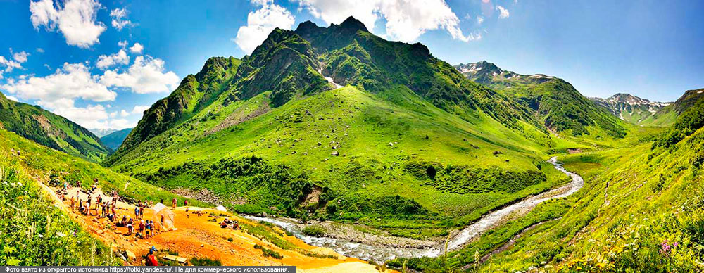 - Самостоятельные туристы и организованные группы начинают свой пешеходный маршрут к Софийским водопадам и Софийским озерам именно с одноименной поляны. Здесь можно купить экскурсию у местных проводников и доехать с ветерком до достопримечательностей Софийской долины. Истоки Софийского водопада находятся на горе София. С огромного ледника, лежащего под вершиной, талые воды устремляются вниз с оглушительным грохотом. Отсюда начинается горная река София, бегущая по долине между Софийским хребтом и хребтом Чегет-Чат.