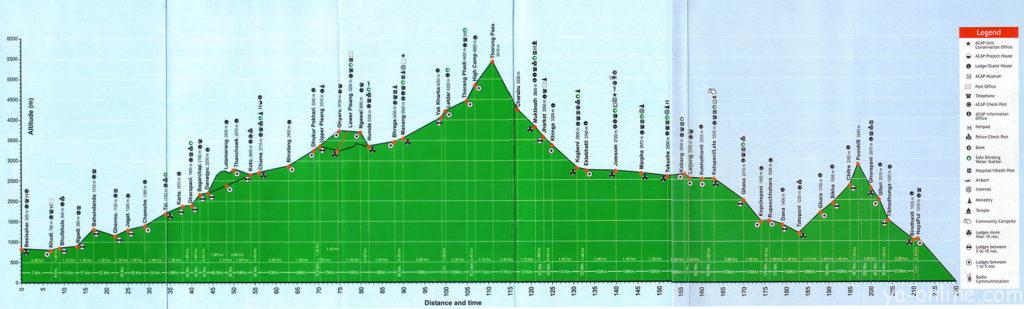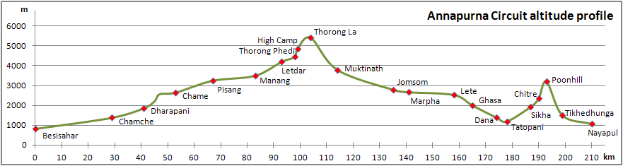 Второй по популярности — трек вокруг Аннапурны. Именно на него и пал наш выбор. Объясню, чем он примечателен (ниже — таблица с передами высот на маршруте).