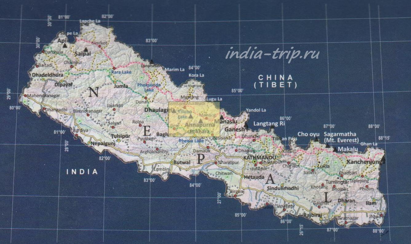 Горный массив Аннапурна расположен в центральной части Непала (карта увеличивается, если открыть ее в новом окне):