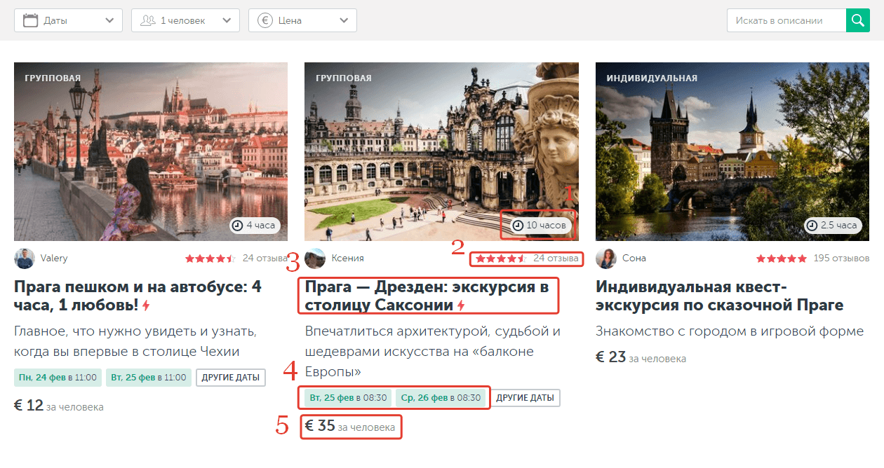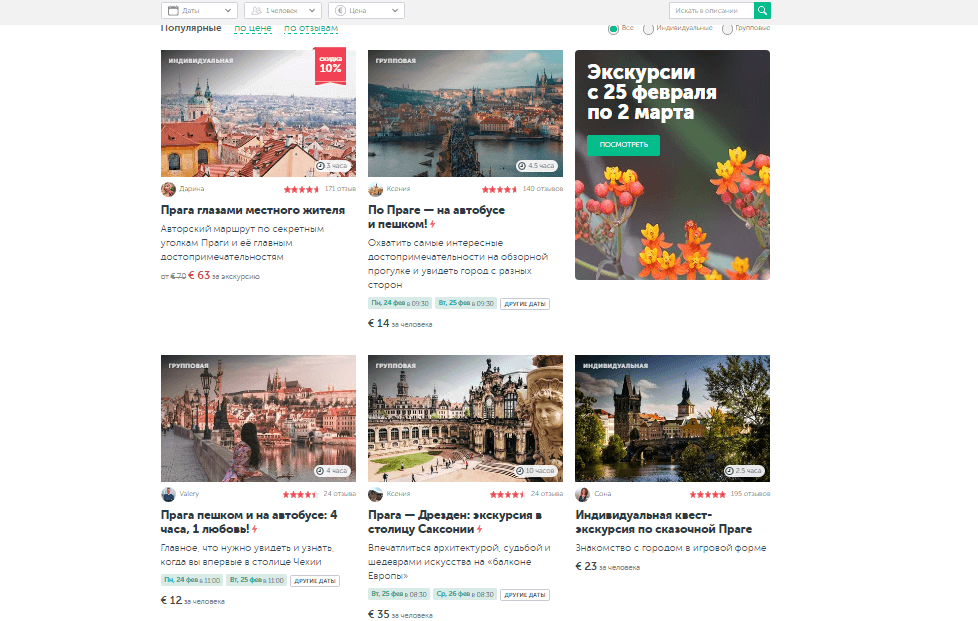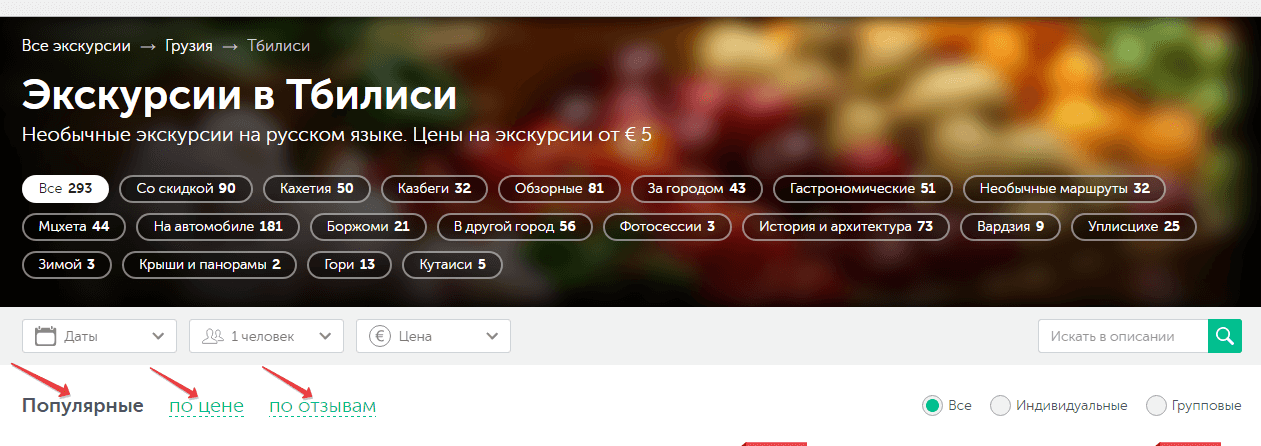 Под этими фильтрами можно выбрать количество экскурсантов и дату, чтобы видеть только те экскурсии, которые можно забронировать на нужный день. Там же, по желанию устанавливается минимальная и максимальная стоимость, а также тип – групповая или индивидуальная.