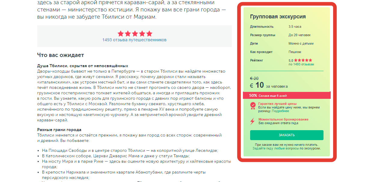 Самая главная информация выделена в зеленом блоке в правой части. Там указан максимальный размер группы, длительность, доступность для детей, категория – пешая или на автомобиле, рейтинг, стоимость и кнопка «заказать».