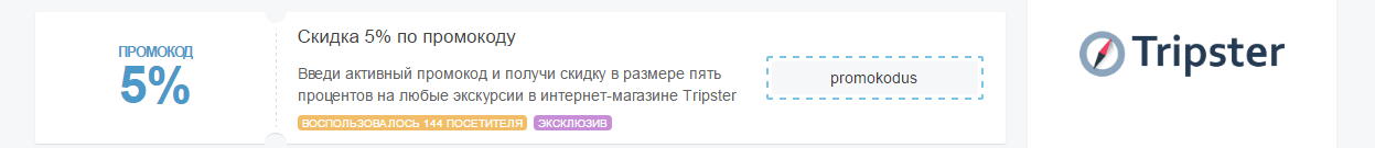 На сайтах-партнерах, а также в блогах, посвященных путешествиям, можно найти промокоды на предложения Tripster. Скидки по ним могут достигать 70% на отдельные маршруты или города. Код надо указывать при оформлении заказа на прогулку в соответствующем поле: