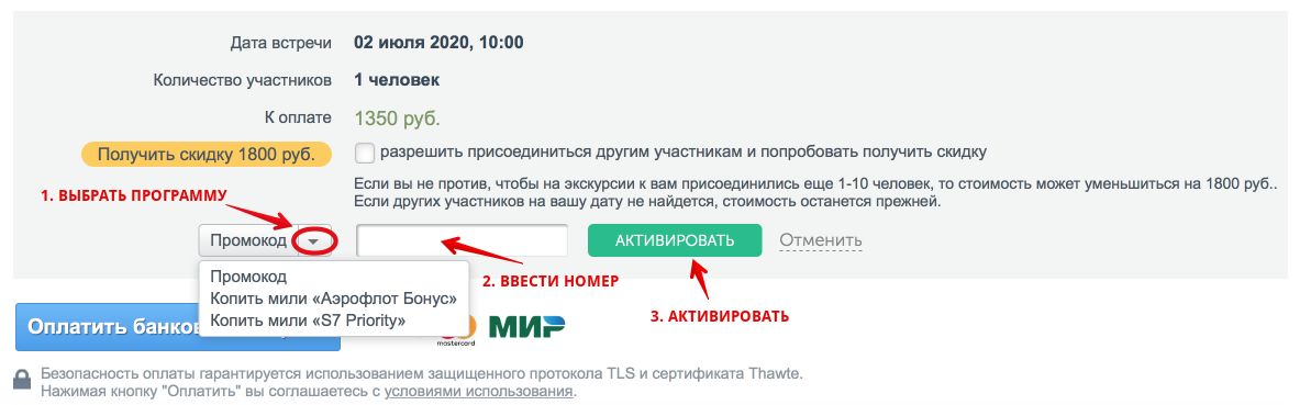 В дополнение ко всевозможным скидкам и кэшбэкам, буквально на пустом месте можно накопить ещё и мили авиакомпаний. Опция кроется там же, где и промокод. Правда, использовать это вместе с уже не получится. Надо выбрать что-то одно.