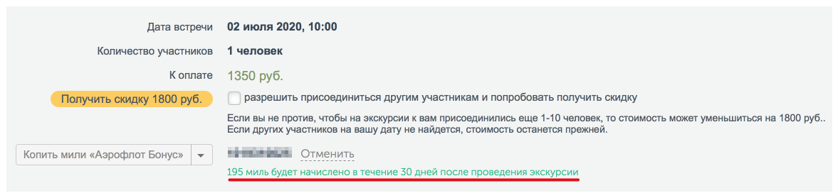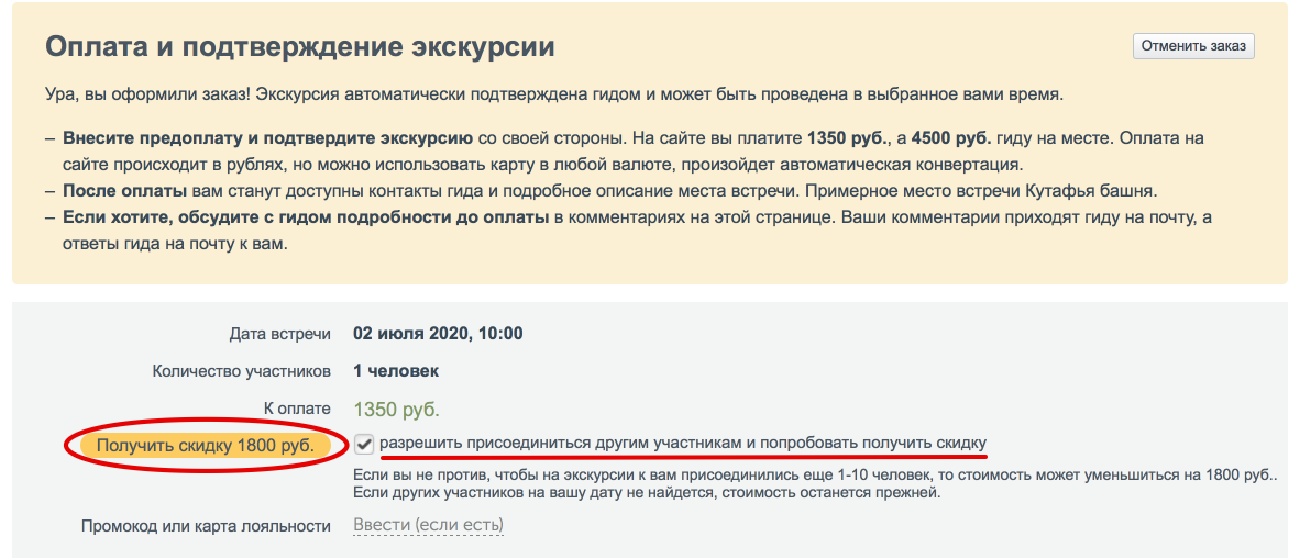 Есть опция сэкономить на индивидуальной экскурсии, разделив расходы с другими возможными её участниками. Поставив эту необязательную галочку, ты выражаешь согласие на то, что к экскурсии могут присоединиться другие люди. С этого момента экскурсия обретает формат «мини-группы». Это никак не влияет на размер предоплаты и не гарант того, что скидка применится. Но, ежели на ту же дату и время найдутся и другие желающие, то получиться сэкономить около 30%. Что, в общем-то, неплохо. Если нет, то стоимость останется прежней.
