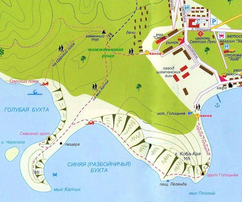 Раньше Тропой Голицына можно было дойти до самого Царского пляжа, но после землетрясения 1927 года часть дорожки обрушилась, и теперь, прежде чем понежиться на пляже, надо обойти другой, дальней тропой.