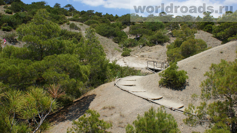 После лестницы пройдите через каменный шалаш и по сыпучим тропинкам спуститесь в долину Рая, зажатую между горами. С ее редкими деревьями и кустарниками она выглядит очень идиллически, как сад — кстати, ее вы видели с Космоса. Отсюда дальше тропинки ведут на вершину горы Караул-Оба.