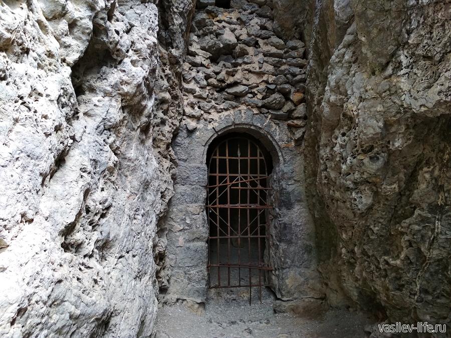 Естественно, той двери уже давно нет, вместо нее появилась решетка, закрывающая вход. С другой стороны, пещерное образование имеет две галереи с лестницами из камня, также оборудованными Л. Голицыном.