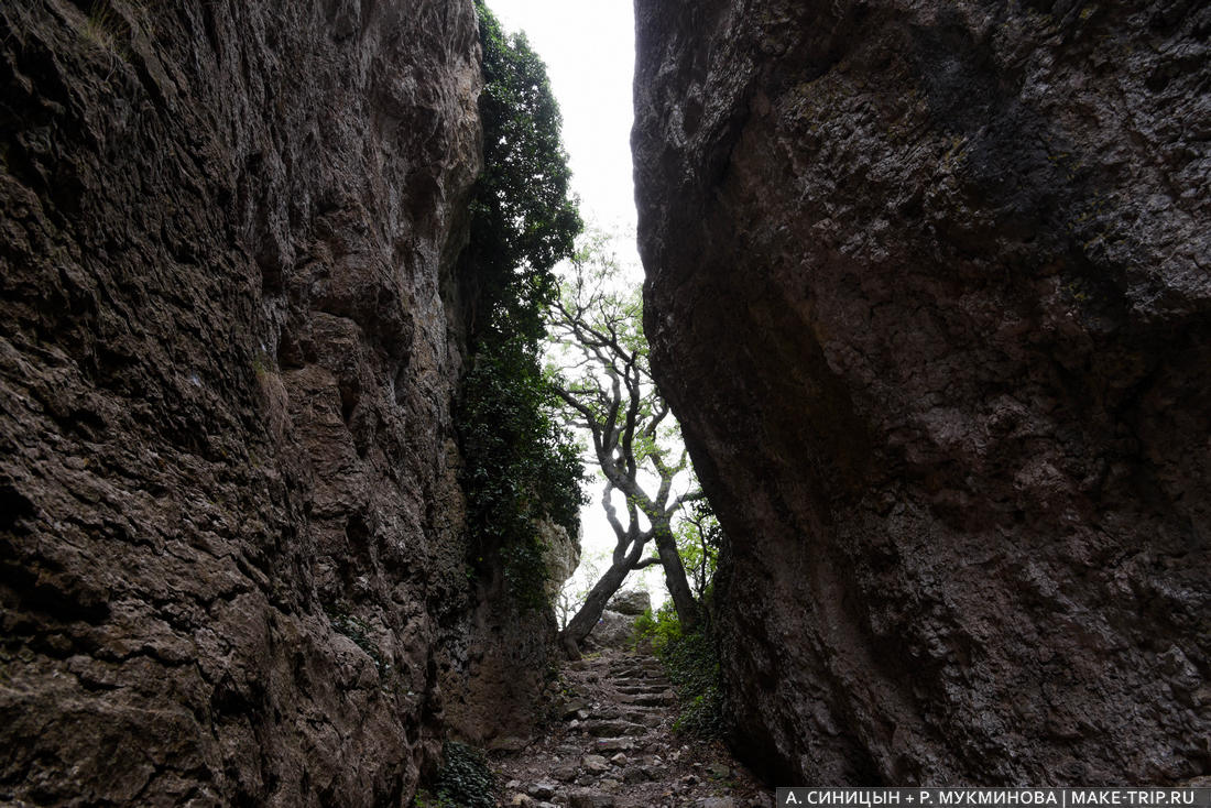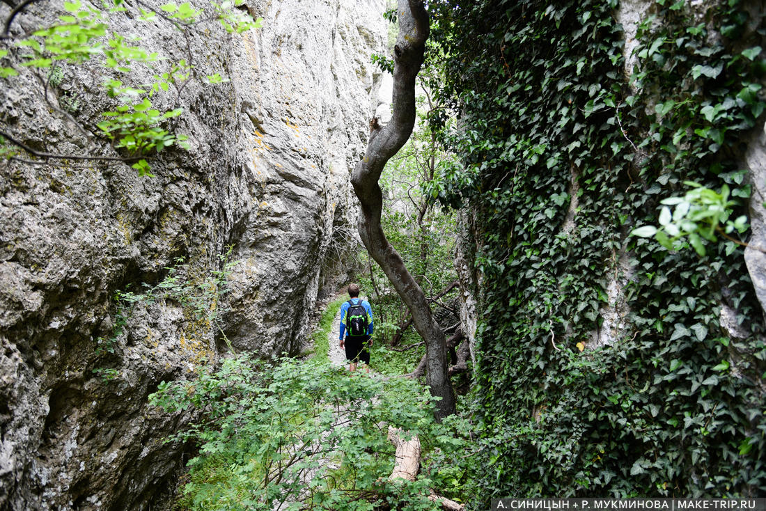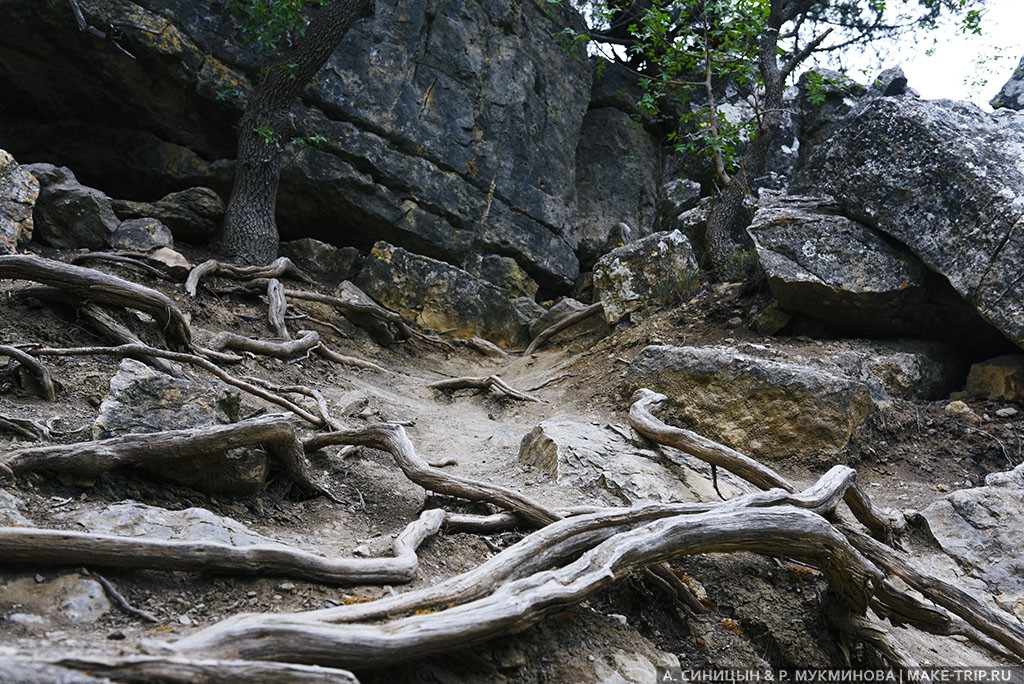 Отсюда можно подняться на пик Космос, а также спуститься в долину Ада (координаты: 44.817682, 34.896018). К ней ведет крутая тропа из корней деревьев и камней. Ад живописный, но мы туда не стали спускаться — пошли к Космосу и Раю.
