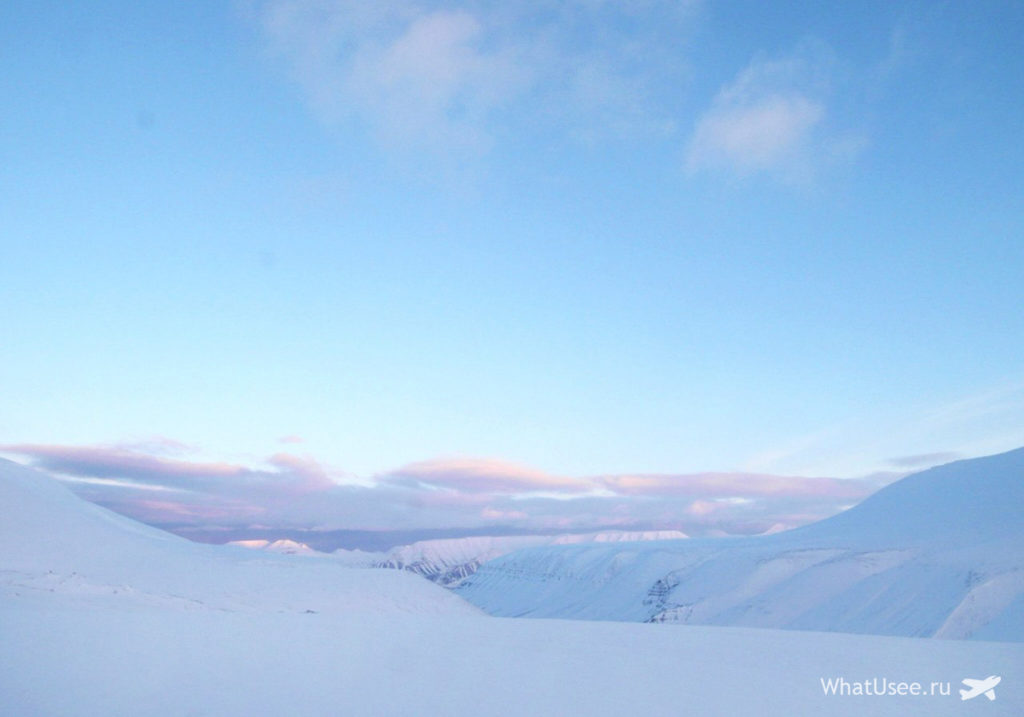 В 11 часов начался рассвет Каждое утро на Шпицбергене невообразимое! Чистейшее утреннее небо окрашивается во все оттенки розового и персикового цветов, вскоре набегают облака, и наступает обычный арктический зимний день.