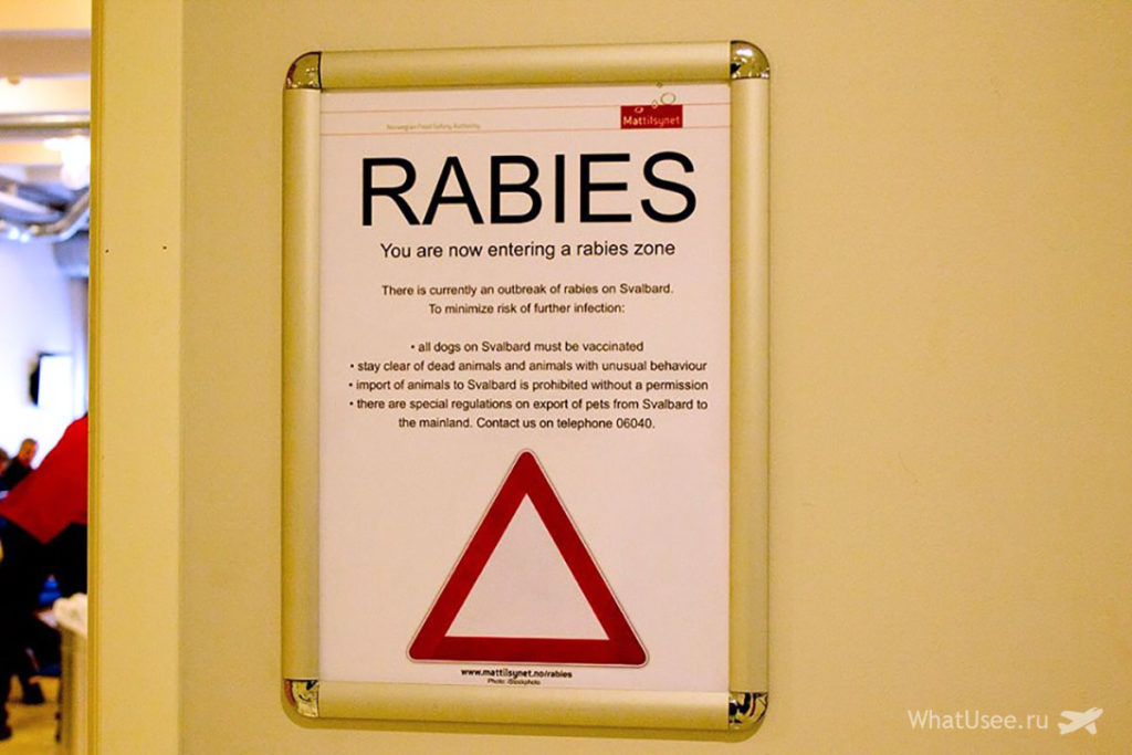 Предупреждение в зале вылета Тромсё, откуда был рейс на Шпицберген. На острове бушует эпидемия собачьего бешенства! А мы как раз заказали экскурсию на собачью ферму