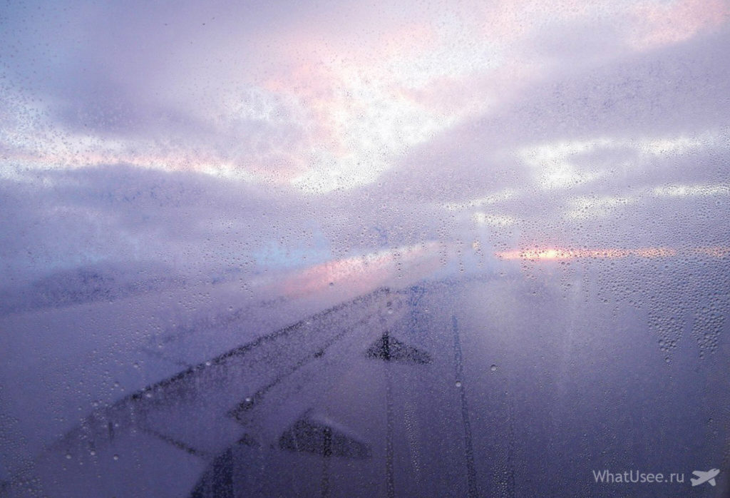 Красивейший закат над облаками. Через пару секунд самолёт нырнёт вниз, под облака, где полярная ночь — и мы окажемся на архипелаге Шпицберген.
