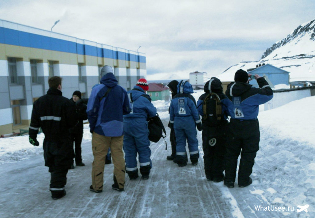 Экскурсия началась в южной части Лонгйира, Nybyen. Там мы встретились с гидом и облачились в каски и снегоступы.