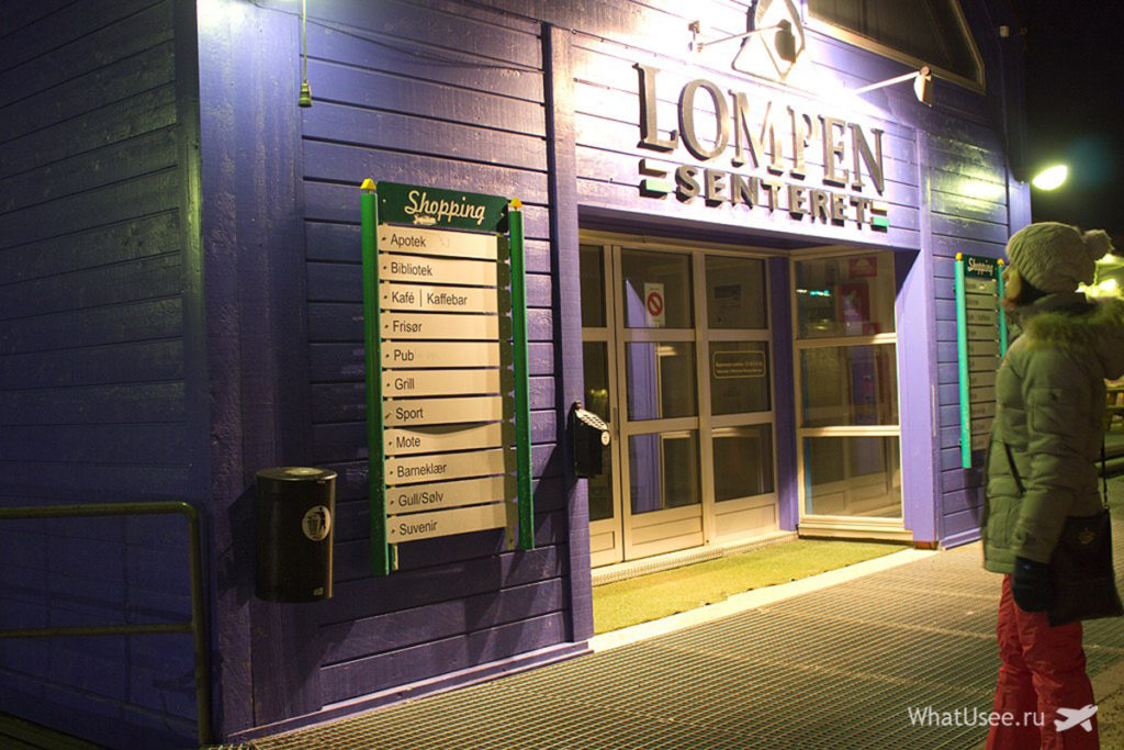 Немного о супермаркетах в Лонгйире. На фото — двухэтажный торговый центр Lompensenteret (здесь же находится супермаркет). Внутри есть несколько кафе, кажется, даже суши