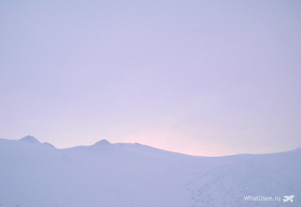Уже около полудня, небо окрашивается в розовые краски. Поверьте, 2 часа пешком в гору стоят того, чтобы увидеть рассвет над Арктикой!