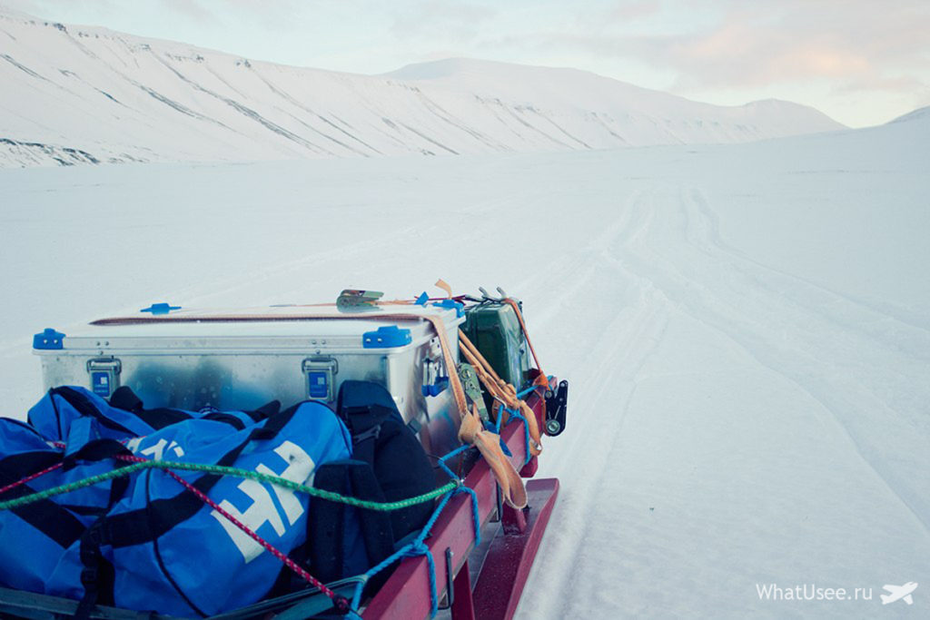 По пути в Лонгйир мы попали в переделку. Один из снeгоходов сломался (а ехали мы вчетвером — по двое на снегоходе), и мы час ждали помощи, отправив храбрую норвежку Дорин обратно в Баренцбург. Помощи не последовало, пришлось скреплять два снегохода вместе, и сзади цеплять сани с провиантом. Так и поехали.