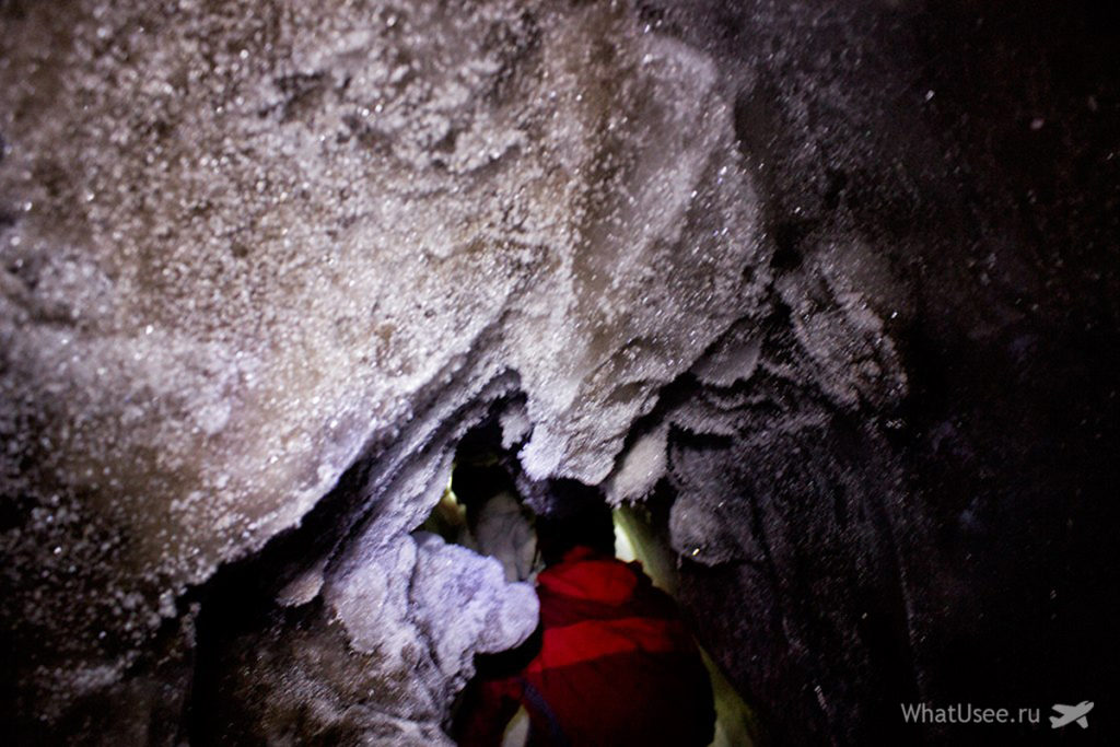 Вход, точнее, залаз в ледник Larsbreen на Шпицбергене. В конце года, как правило, в октябре, гиды ищут место для входа в ледник. Затем они ждут, пока морозы окончательно не укрепят снег и лёд вокруг этого места, расчищают залаз и следят, чтобы его не занесло снегом. Внутрь надо спускаться по верёвочной лестнице.