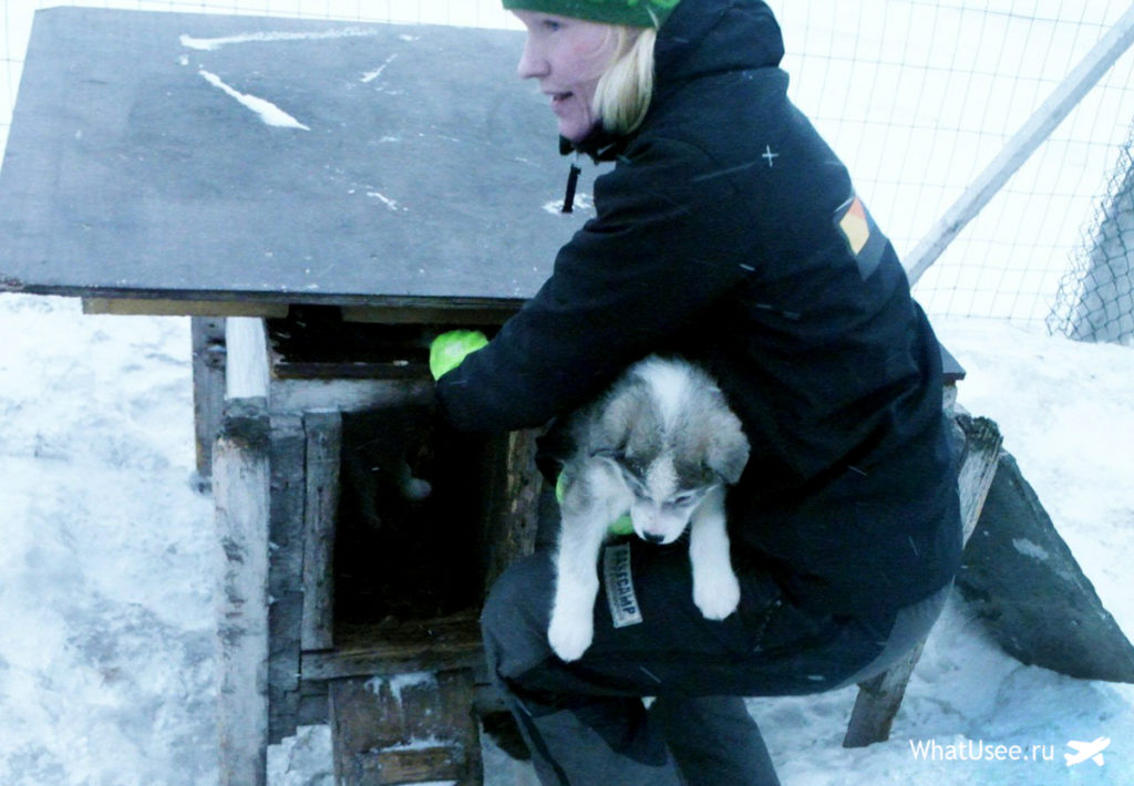 После сафари можно немного прогуляться по ферме и поиграть с щенками. Теа приехала из Финляндии и работает на Шпицбергене на ферме с собаками. Достаёт нам щеночка потискать.