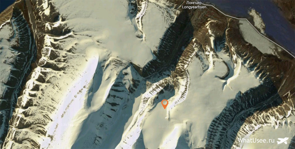 Итак, что из себя представляет поход по леднику на Шпицбергене. Гид отвёл нас на гору с говорящим названием Sarkofagen, где расположен ледник Larsbreen. Вот он, на карте Лонгйира: