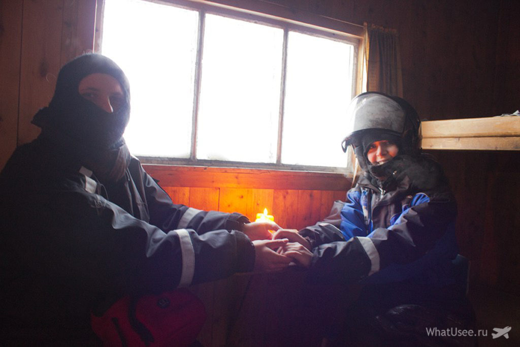 Внутри хижины койка, чайник, сухарики, чай. Каждый, кто едет по маршруту, останавливается периодически и подкидывает что-то из провианта — кто знает, вдруг воспользоваться этим нужно будет именно тебе?