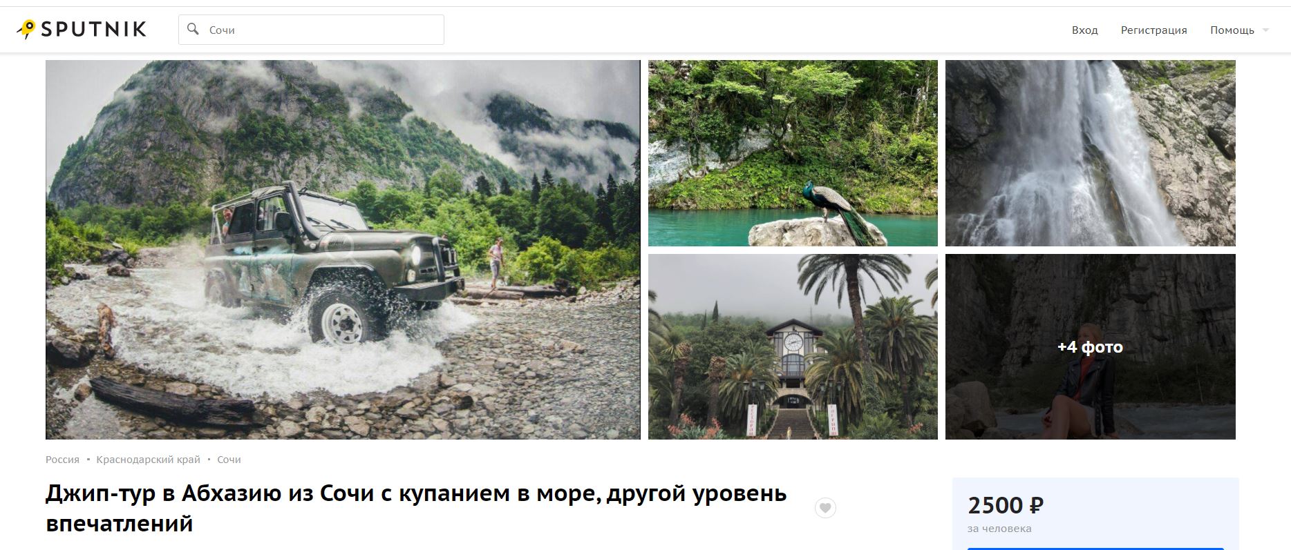 Отважные путешественники, не хотите ли вы попасть на «Джип-тур в Абхазию из Сочи»? Это экскурсия на 1 день в мини-группе, билет на которую вам обойдётся в 1900 рублей. Планируйте её на любой день. Начало в 07:30.