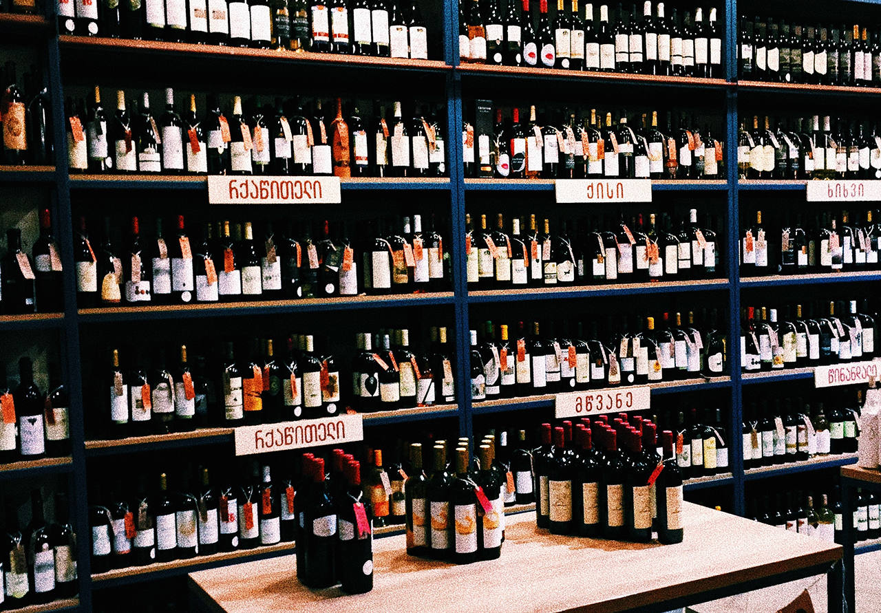 Винные полки в магазине Тбилиси (Фото: unsplash.com / @anastsiia_voiten)