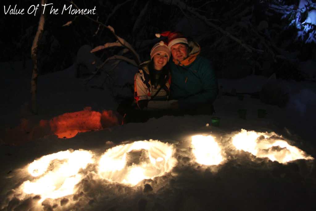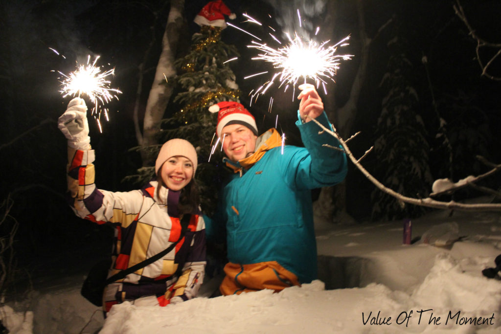 А еще за время этой поездки у нас был очень интересный опыт – мы отмечали Новый год в лесу! Началось все с того, что у меня давно была такая странная мечта – отметить Новый Год в лесу. Наверное, порой наша жизнь становится слишком предсказуемой, и нам хочется поверить в какую-то сказку. Не знаю почему, но, когда я представлял себе Новый Год в лесу, воображение рисовало кадры из таких старых советских мультфильмов как «Морозко» или «Двенадцать Месяцев». Конечно, к нам в лес не пришел Дед Мороз или еще какой-нибудь зимний волшебник, но время мы провели очень здорово! Чтобы не замерзнуть в лесу, мы взяли с собой большой термос с горячим глинтвейном, пожарили в лесу шашлык, послушали по радио речь президента и под бой Курантов открыли шампанское! Также мы нарядили живую елочку – настоящую зимнюю лесную красавицу и в заключение празднования Нового Года запустили разноцветные фейерверки Этот Новый Год мы встретили в гармонии с потрясающей северной природой и в компании хороших друзей. В общей сложности в лесу мы провели около 2 часов, но это маленькое путешествие в зимнюю сказку надолго осталось в сердце у каждого из нас