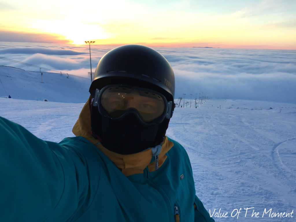 И катались мы в этот день тоже прямо в облаках. Суть в том, что ты едешь на сноуборде и видишь ту границу, где начинается облако! Заезжаешь в него, какое-то время едешь как в тумане, а потом выезжаешь из облака и снова все как на ладони. Непередаваемое ощущение!