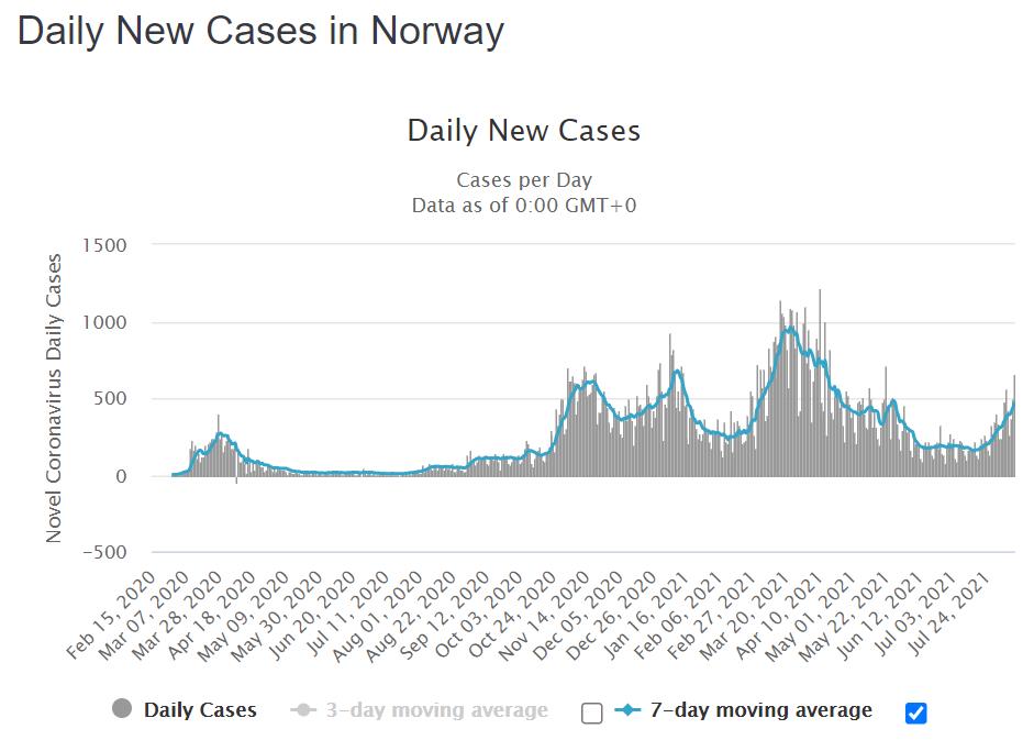 Что там с коронавирусом? Судя по официальной статистике число новых случаев начало расти в июле. Темы массовой вакцинации относительно высокие: 69.6% получило хотя бы одну дозу вакцины, а полностью привито 36.7% населения.