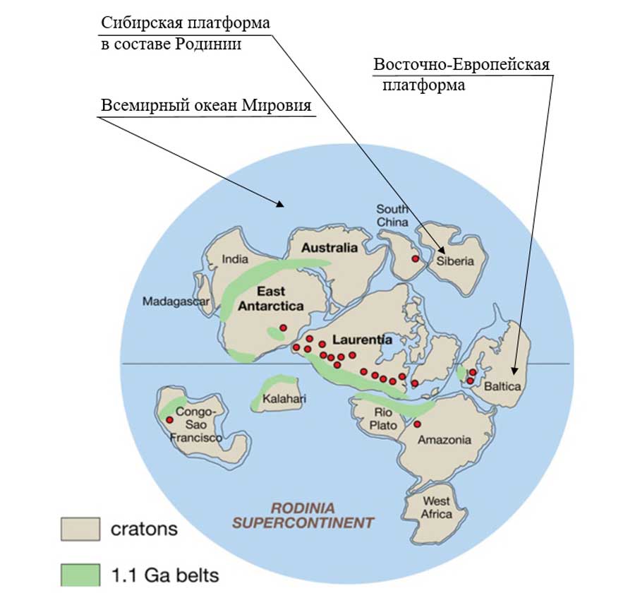 В формировании Уральских гор участвовали в основном Восточно-Европейская и Сибирская платформы. Обе платформы – докембрийские. Фундамент (кристаллическое основание) Восточно-Европейской сформировался в результате столкновений нескольких мелких континентальных блоков примерно 1,7–1,5 млрд лет назад. Большая часть фундамента Сибирской платформы образовалась в архее (4–2,5 млрд лет назад) и в начале протерозоя. Эта платформа – один из древнейших блоков континентальной коры Земли. Процесс образования обеих платформ протекал в протерозое. Предполагаемый суперконтинент Родиния возник в протерозое примерно 1,1 млрд лет назад. Он содержал почти всю континентальную кору планеты. Платформы были расположены предположительно так, как показано на рисунке.