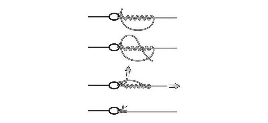 - совершают им 5-6 вращательных движений по оси лески и продевают в одинарную петлю;