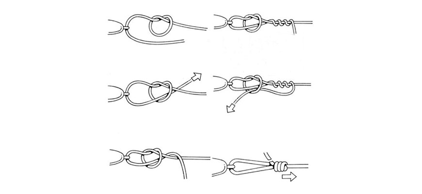 - На основной леске, где уже есть один крючок, делается обычный узел с тремя оборотами нити.