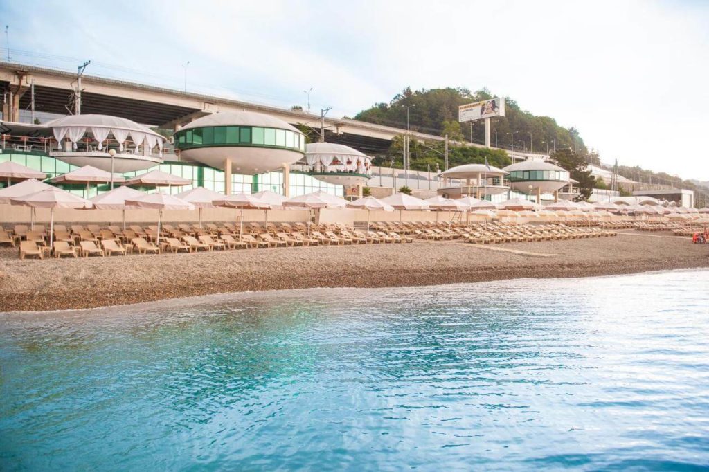 Единственный песчаный пляж есть в Имеретинской бухте, но он искусственный. Пляж принадлежит отелю Radisson 5*, но он бесплатный. Если хотите отдыхать на песке, нужно заплатить за лежак. Так как пляж насыпной, у кромки воды и при входе в море все равно галька, так что понадобятся аквашузы. Узнайте, где на юге России найти песчаные пляжи.