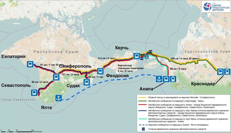 Прямого сообщения между полуостровом и городами России — нет. Поэтому в прошлом году был внедрен «Единый билет». Суть его проста, турист на поезде добирается до Анапы или Краснодара, а потом на «автобусе – пароме – автобусе» до Крыма.